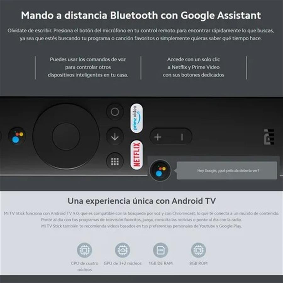El Xiaomi Mi TV Stick tiene un mando a distancia en el que se integra el Asistente de Google, por lo que puedes controlarlo todo con la voz.